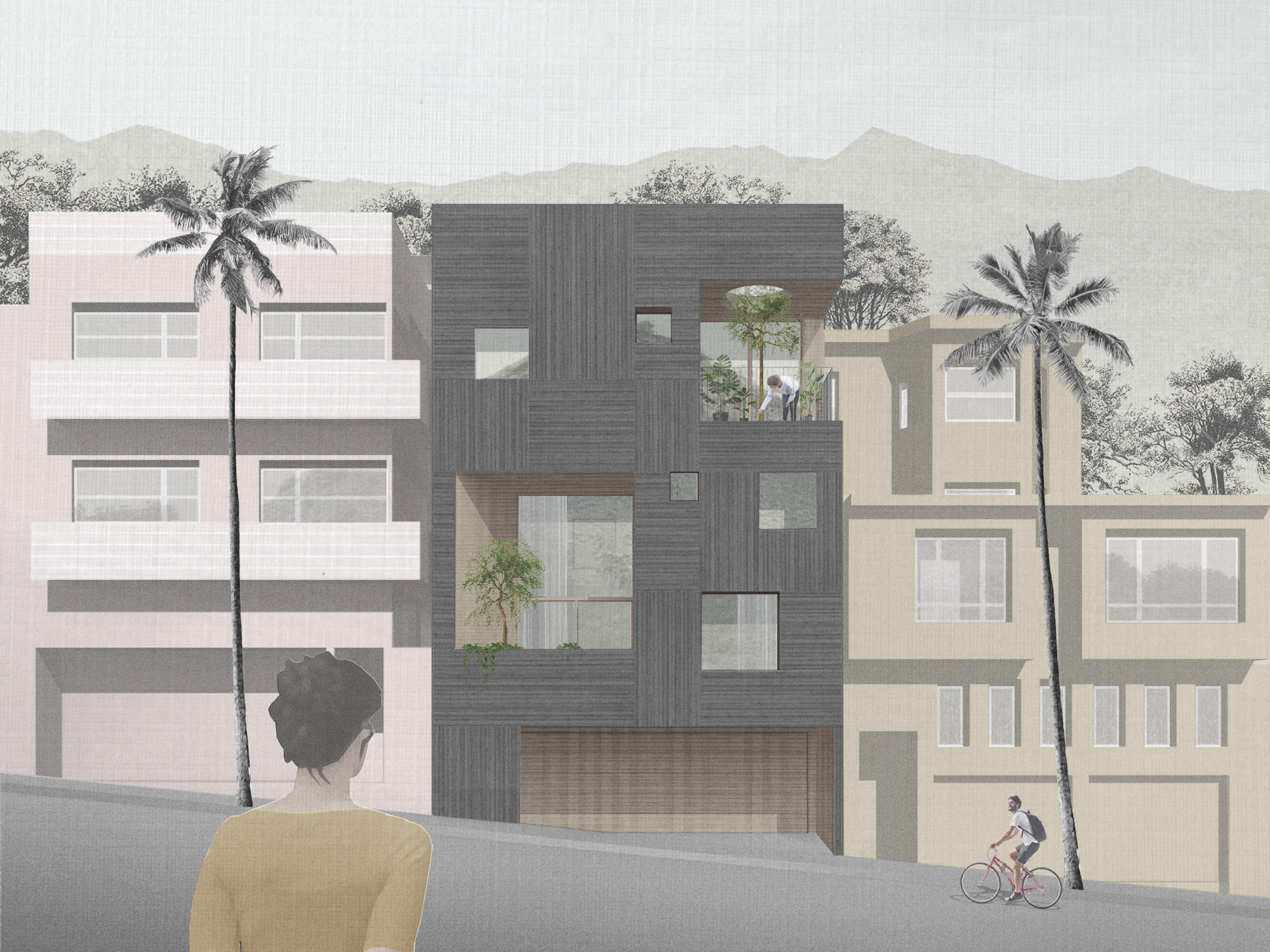 The Mountain House is a 2500 sf horizontal addition to an existing house in Corona Heights neighborhood of San Francisco. The project splits the house into three stacked units — a two-bedroom townhouse, a three-bedroom family apartment, and a one-bedroom roof terrace apartment. By layering these lifestyles and increasing the density of the typical San Francisco home, affordability and quality are simultaneously achieved while increasing the diversity of the neighborhood. Situated across from the apex of hill of Corona Heights, the surreal encounter between nature and the city is heightened through the facade. The depth of the surface utilizes a series of voids to bring the hybrid context—nature and city—to the interior of the domestic realm.