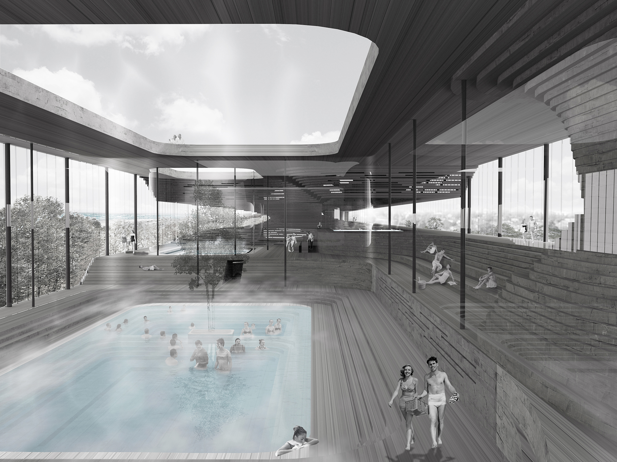 Steam Stratum is a proposal for a civic building that consolidates the various programs for the thermal bath and park and structures them within a line. This line serves as a threshold between the city of Liepaja and the Baltic Sea — allowing for a public as well as natural interface between the city and the sea. Steam Stratum taps into the rich geologic history of Latvia and the presence of natural thermal baths. Conceived of as an extrusion of the sedimentary rock below, the building is organized into various layers, or strata. These layers are organized to separate and connect the differential programs in a precise manner. As the topographic cut moves through the building it interacts with the different levels to allow for seamless navigation through the linear resort. The thermal baths are organized into one fluctuating datum that is carved into an overall terraced topography. This stone platform can be flooded to differential heights to allow for different pool sizes and configurations to enable flexibility during different seasons. The depth of the pools creates natural temperature differentials and associated amounts of steam. The ceiling of the baths has a precise stepped carving to move the steam to various areas in the ‘cave’ to provide privacy and concealment for more intimate spa programs above. A series of skylights are deployed across the roof plane to exhaust this steam from the building and create a steam park on the roof. The atmospheric qualities of an ephemeral enclosure are leveraged to create a series of soft divisions along the roof park.